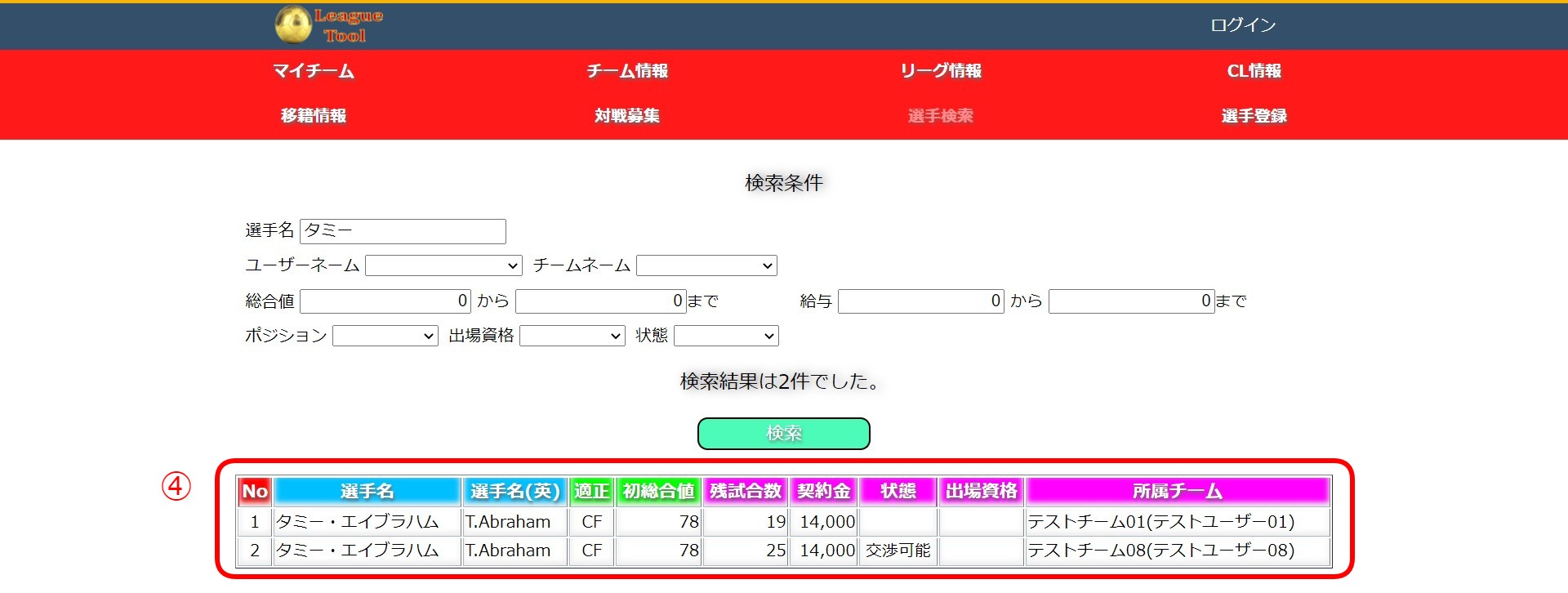 押下すると検索を開始し、条件に該当した選手を抽出します。