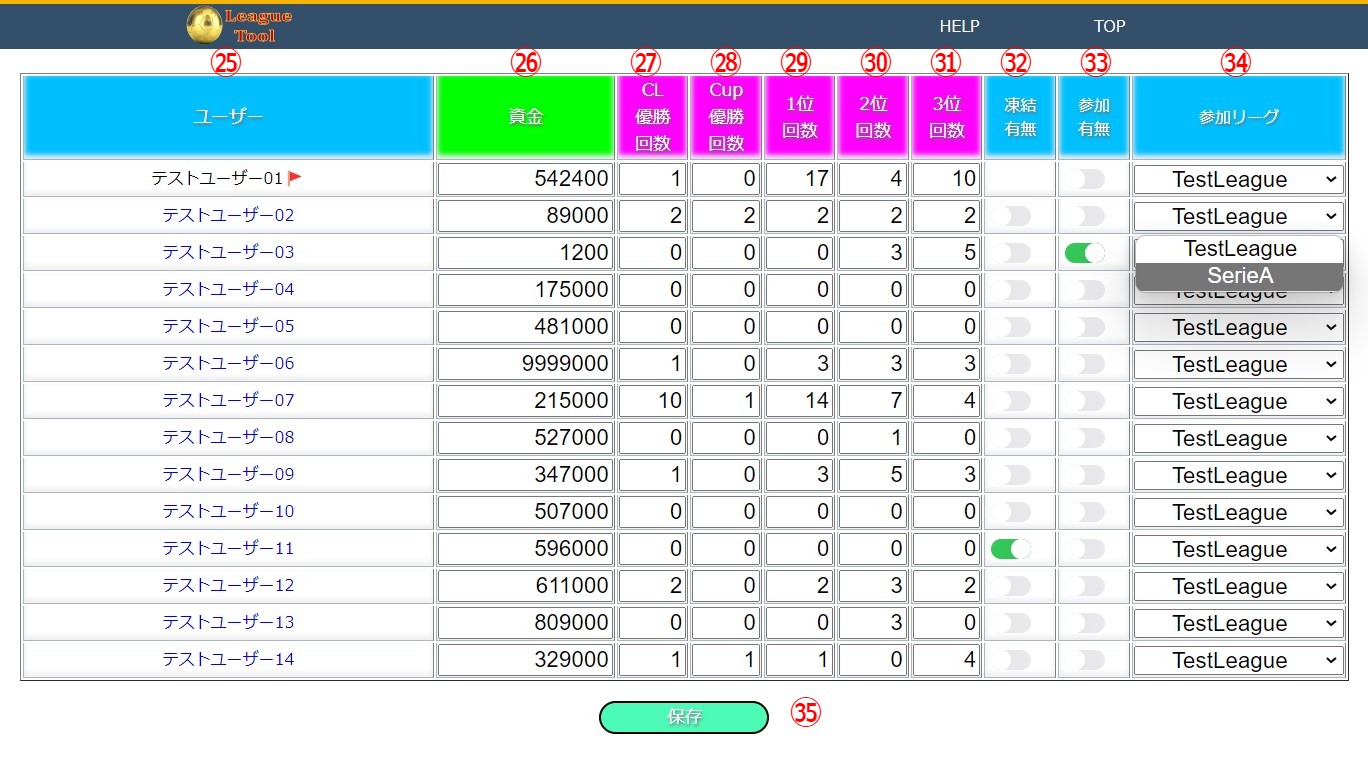 ※リーグ編集画面はリーグ運営権限を持つリーグリーダーのみが編集可能です。