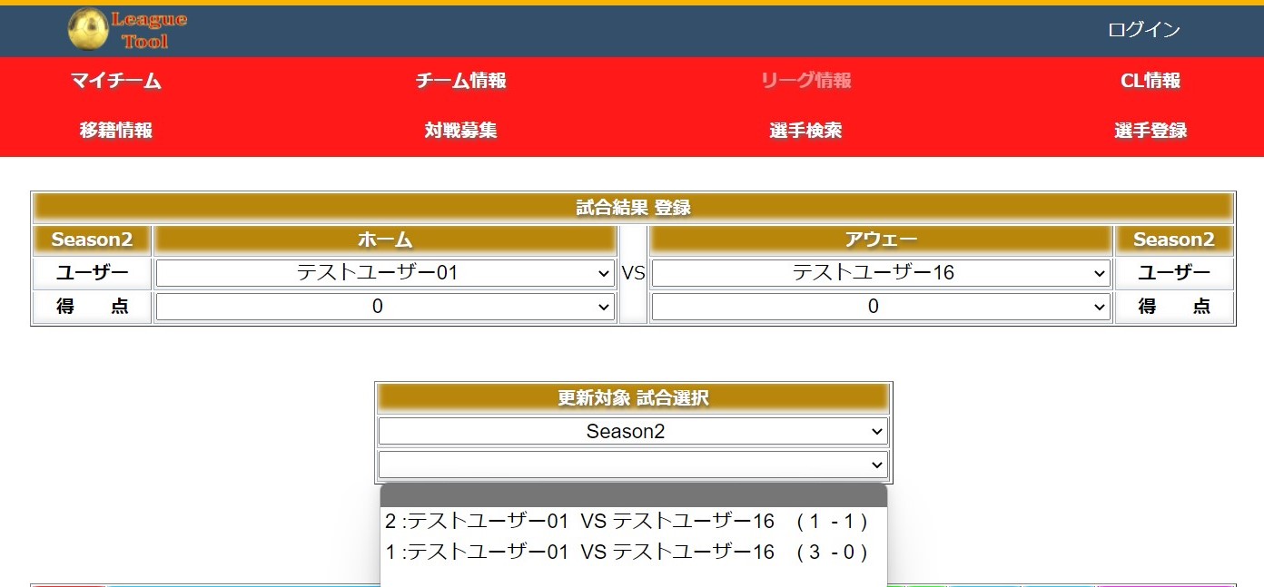 リーグ情報の閲覧・編集が可能な画面です。「ホームユーザー」「アウェーユーザー」「ホーム得点」「アウェー得点」 を入力し試合を登録します。「ホーム得点」「アウェー得点」が1点以上の場合、得点・アシスト選手入力欄が表示されます。 得点・アシストは任意登録になります。入力した場合、得点・アシストランキングに集計され、シーズン終了時の集計時に 得点王ボーナス、アシスト王ボーナスが付与されます。