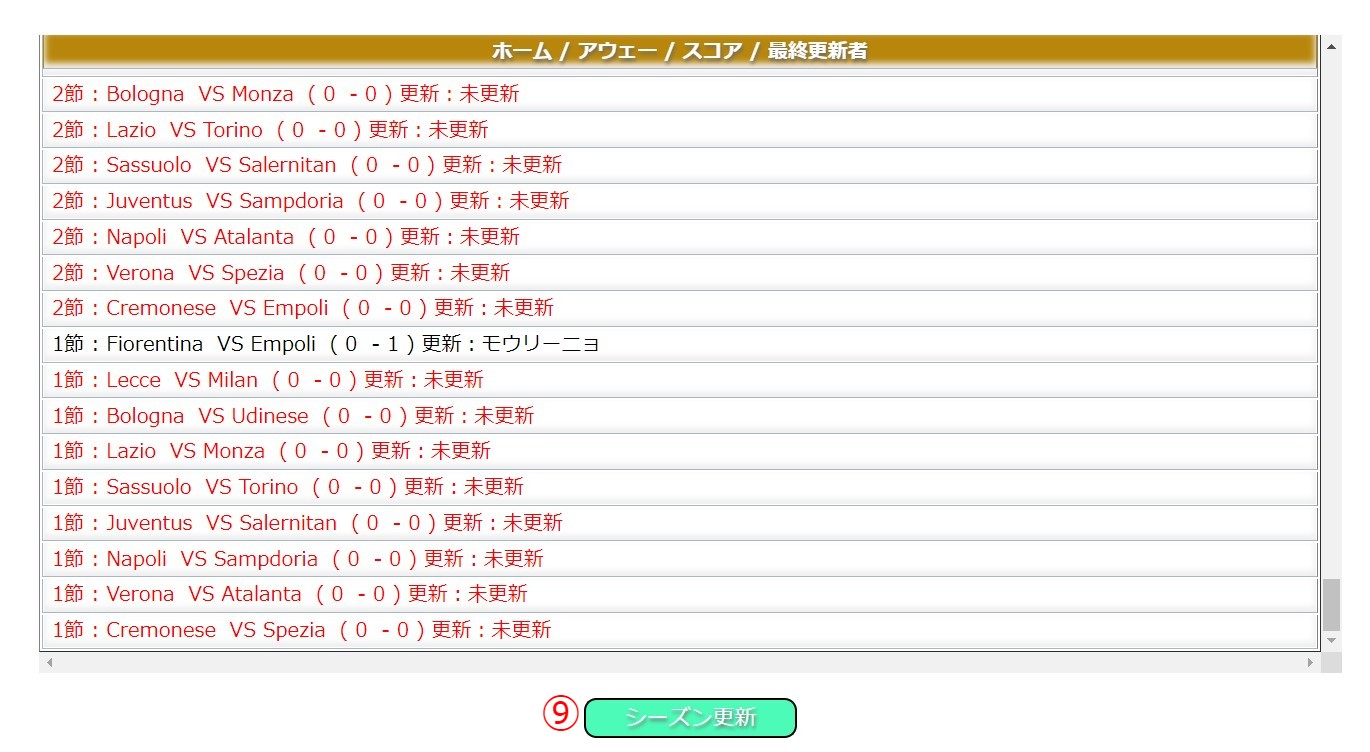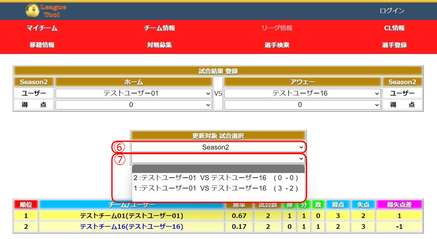 登録した試合内容の対戦者、スコア、得点アシストを変更し更新することが可能です。 ⑥で対象シーズンを選択すると⑦に自チームが関わる対戦履歴がリスト表示されます。 更新したい試合を⑦で選択します。