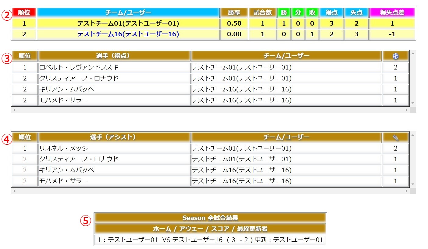 全て入力が完了したら「①保存ボタン」を押下してください。試合内容の登録が完了すると、 ②にリーグの順位表が表示されます。また、③に得点ランキング、④にアシストランキングが表示されます。 ⑤には対象のシーズンに登録されている全試合を表示します。更新項目には最終更新者が表示されます。
