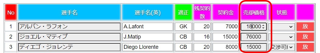 初期総合値表記が非表示になり売却価格の設定が追加されました。任意で売却価格を設定することで他チームへの アピールが可能です。また、選手検索画面の売却価格絞り込みで抽出に影響します。 売却価格を設定しない場合はデータベースに登録されている初期移籍金が表示されます。