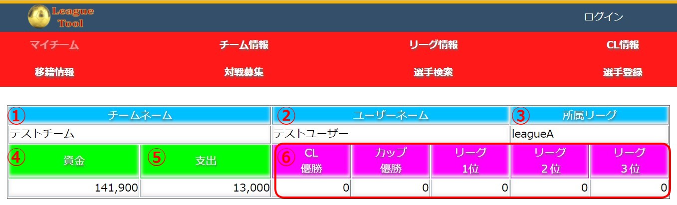 個人毎のユーザーID・パスワードを④に入力し⑤ログインボタンを押下すると所属リーグにログインします。