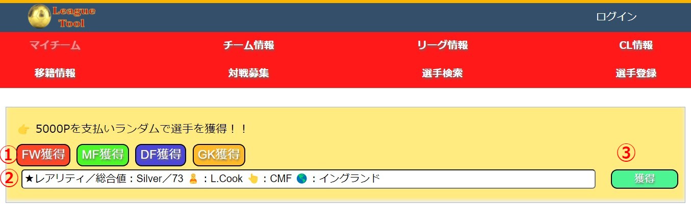 排出された選手は②に表示されます。獲得する場合は「③獲得ボタン」を押下してください。