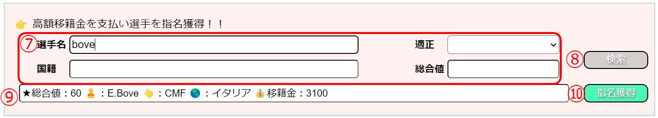 指名方式の選手獲得メニューになります。獲得したい選手の氏名(日本語または英語等)を⑦の「選手名欄」に 「⑧検索ボタン」を押下し検索してください。条件に合わない、または2名以上検索に該当する場合「該当する選手 が存在しません。」の警告メッセージが表示されます。該当する選手が存在する場合は⑨の枠に該当選手が表示されます。 氏名だけで該当しない場合は「国籍」「適正」「初期総合値」等の条件を補足して検索してください。表示した選手を 獲得する場合は「⑩指名選手獲得ボタン」を押下し運営資金から移籍金を支払うことで獲得が可能です。