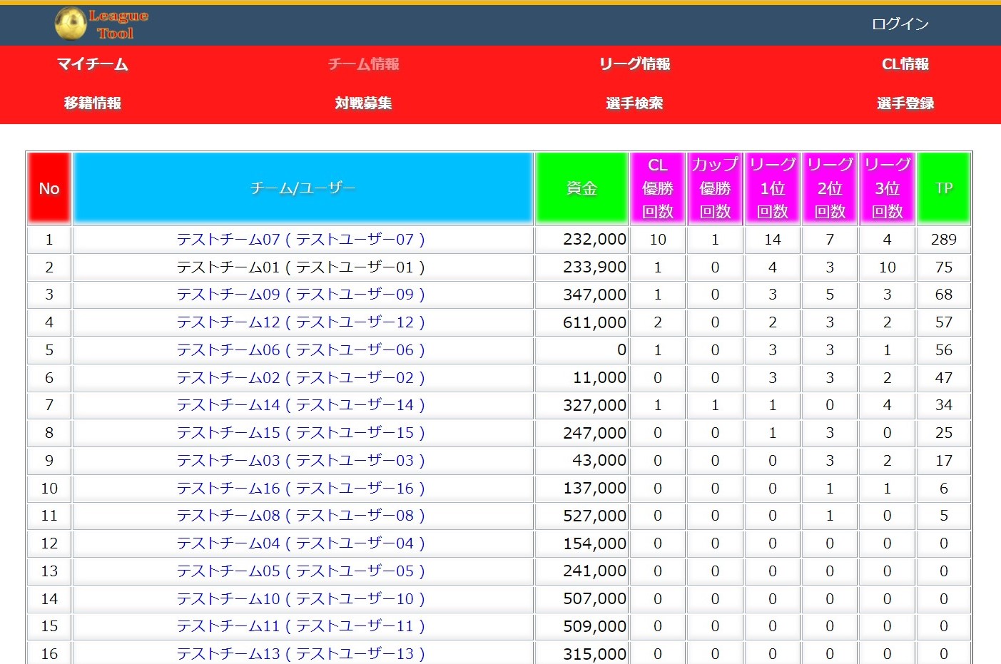 同リーグに参加しているチーム情報が閲覧可能です。閲覧したいチーム/オーナー名を押下してください。 🚩マークがついているユーザーはリーグリーダーです。リーグリーダーは「リーグ編集」「シーズン更新」「全試合結果の更新・削除」の権限 を持ちます。