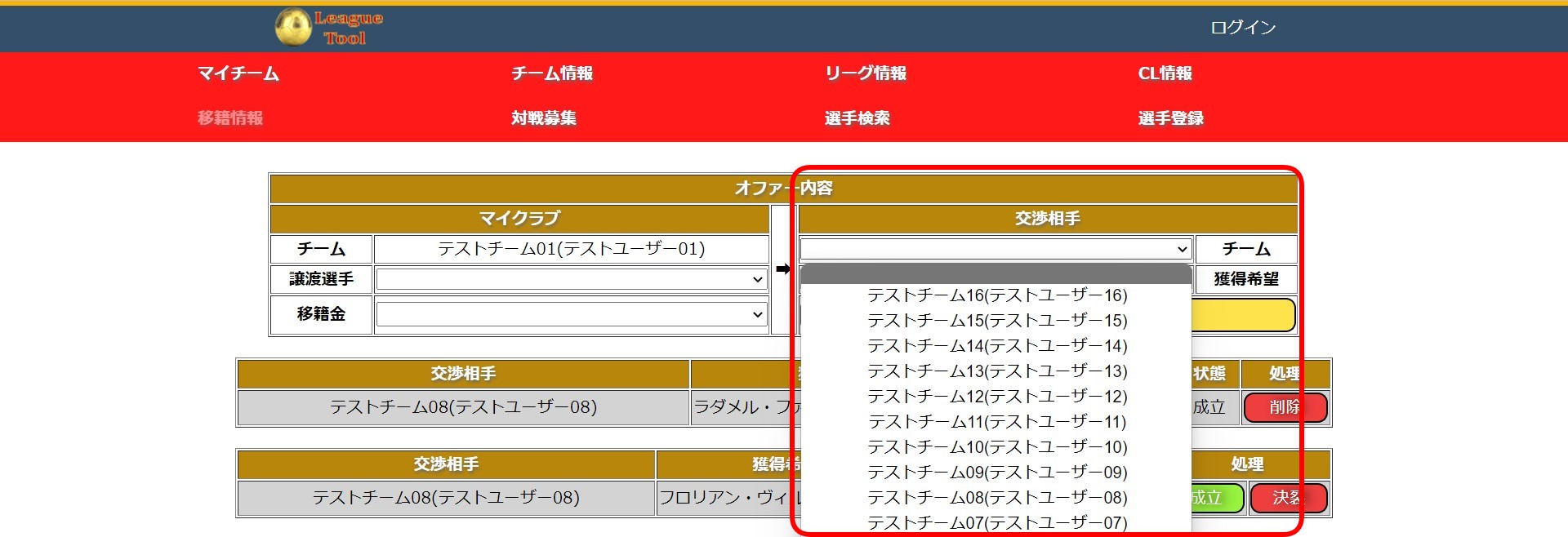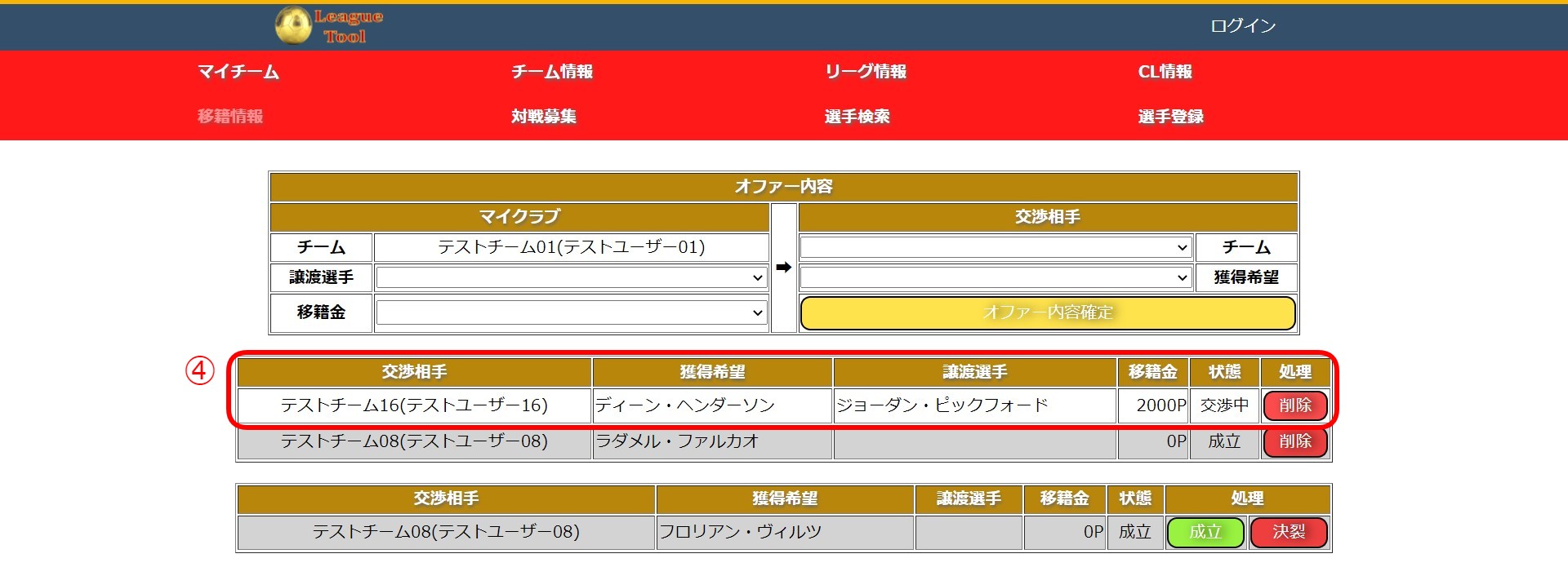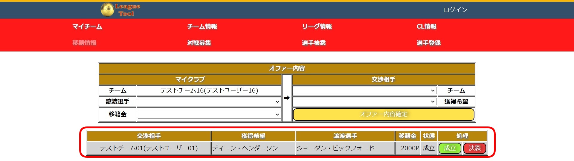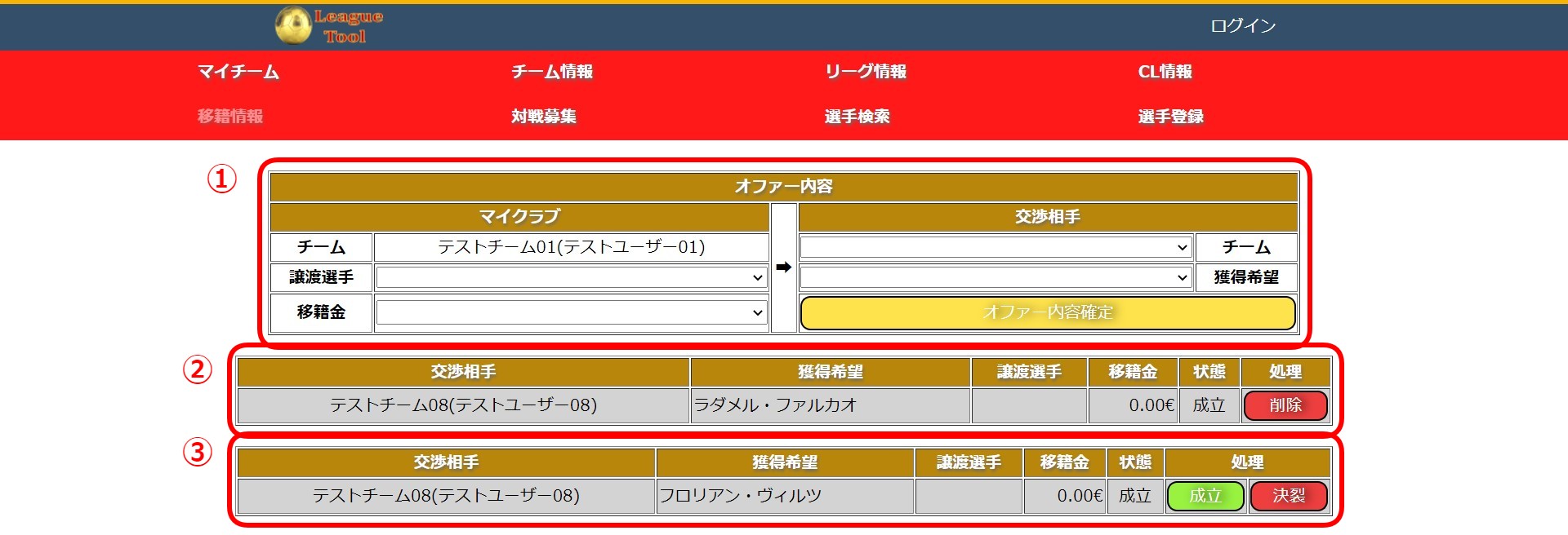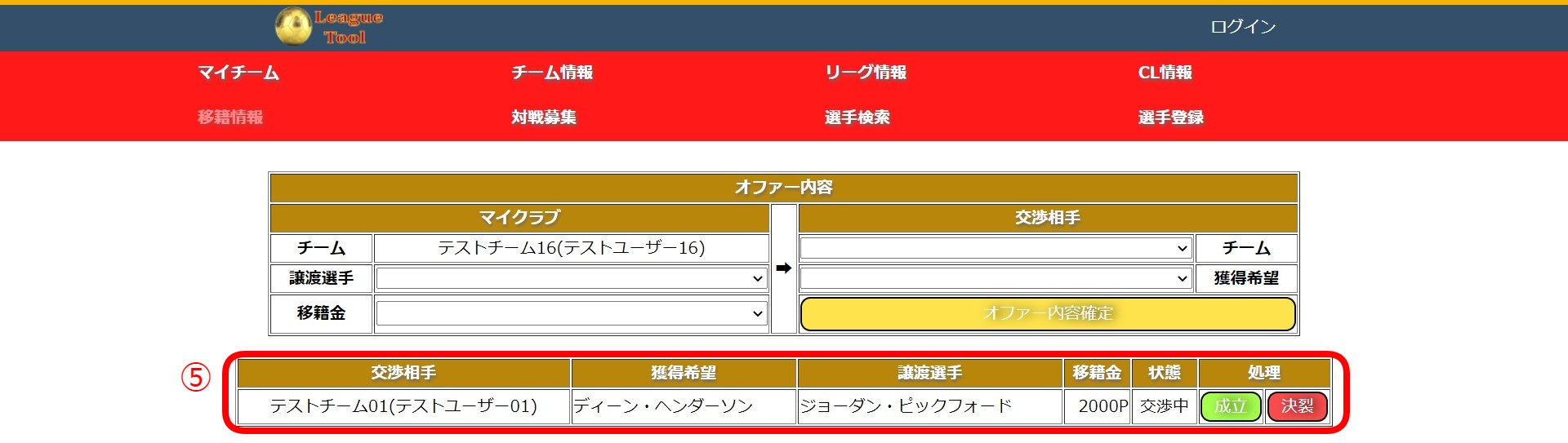 オファー申請があると⑤の枠に他チームからのオファー内容と状態が表示されます。「処理」はオファー進捗を表します。 「成立ボタン」を押下すると移籍が成立し選手と移籍金の移動が完了します。「決裂ボタン」を押下すると 交渉決裂となります。